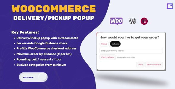 A smart popup that asks customers to choose Pickup or Delivery, validates delivery addresses with Google Maps, and applies a per‑km minimum order (e.g., 2 km ⇒ €20, 30 km ⇒ €30).